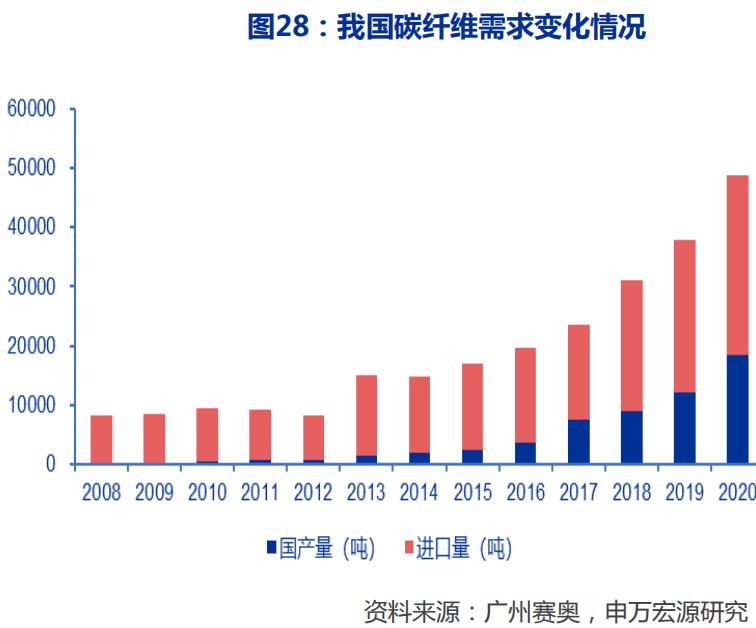 ´Ó¹ú²úÌæ»»½Ç¶ÈÀ´¿´£¬2020Äê¹ú²ú̼ÏËά18500¶Ö£¬Õ¼×ÜÐèÇóµÄ38%£¬Ïà±È2019ÄêµÄ12000¶Ö£¬ÔöÌíÂÊΪ54.2%£¬Ò»Á¬2ÄêÁè¼Ý30%µÄ¸ßËÙÔöÌí£»2018ÄêÔöÌíÂÊΪ21.6%